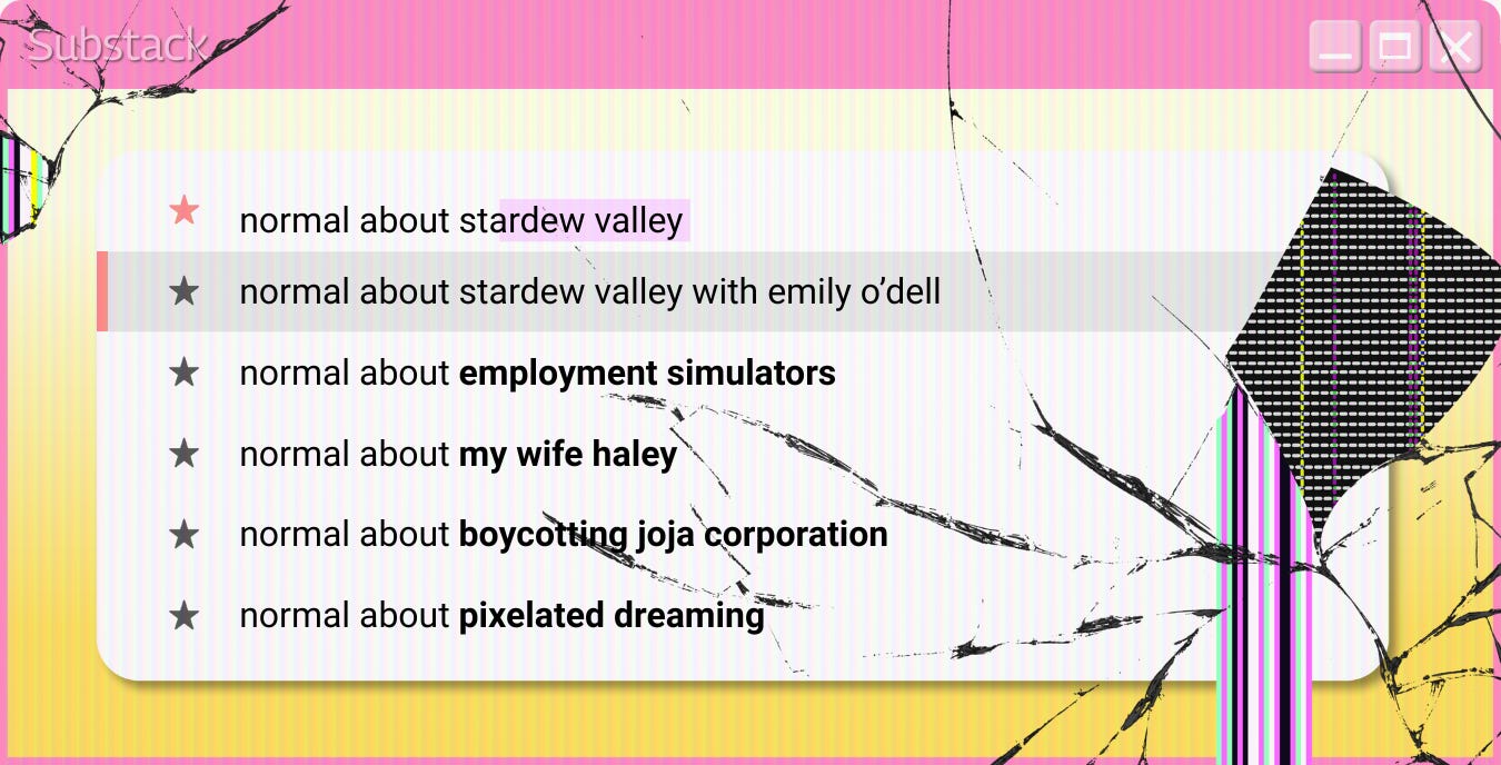 Emily O’Dell is a midwife by trade and a player of farming simulators, also by trade. Today she is feeling normal about Stardew Valley, a video game where you log on and lock in. Besides all the normal chores that come with running an agricultural enterprise, Stardew also lets you start a platonic life partnership with a sewer creature, harvest dinosaur eggs, and farm so good that Jeff Bezos goes broke. Punch enough hours and it’s easy to get sucked into normalcy, Emily says — you might even start dreaming in pixels. Literally.